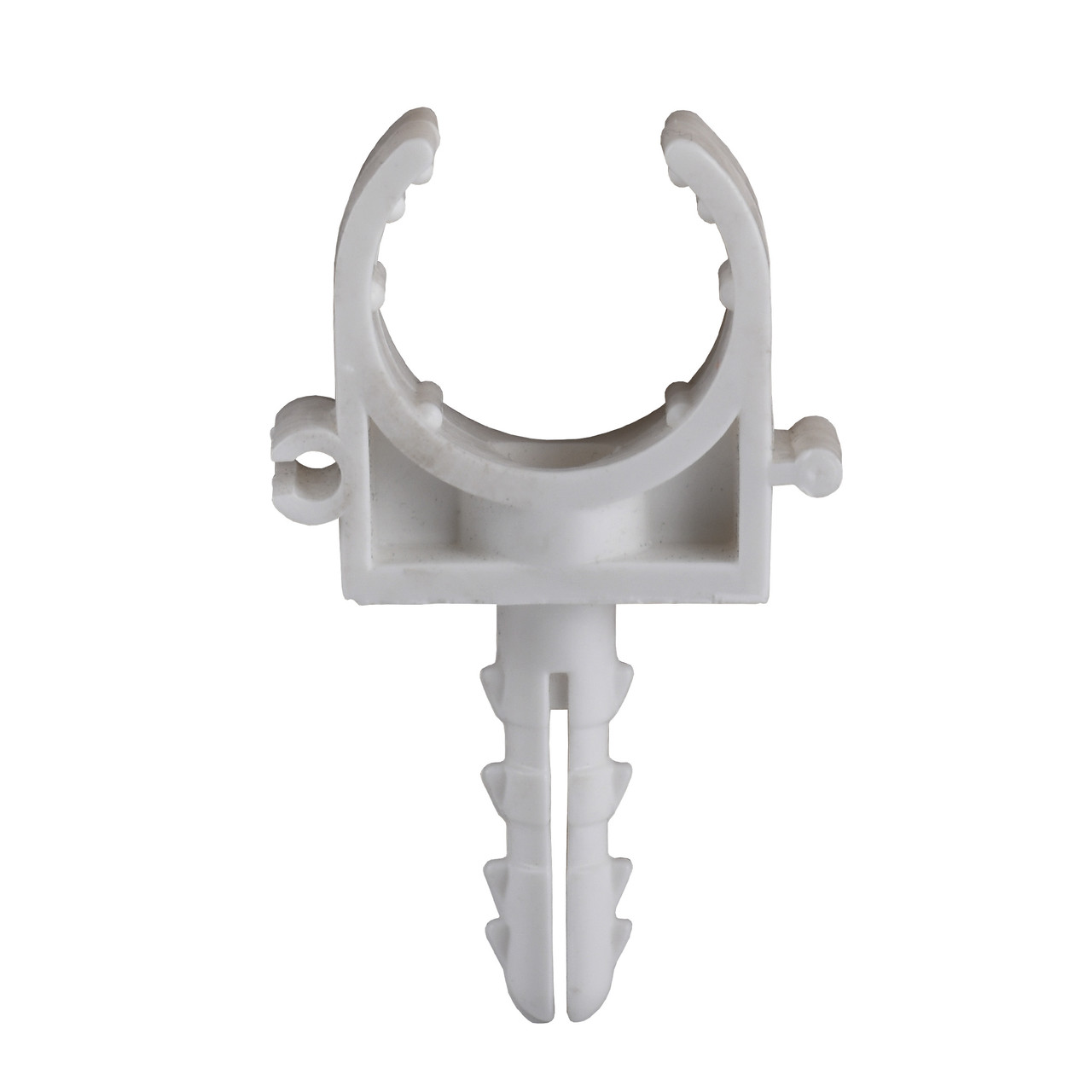 Пластикова кліпса з дюбелем для кріплення металопластикових труб ф20 мм до стіни або підлоги. Забезпечена засувкою з фіксатором для запобігання випаданню труби.